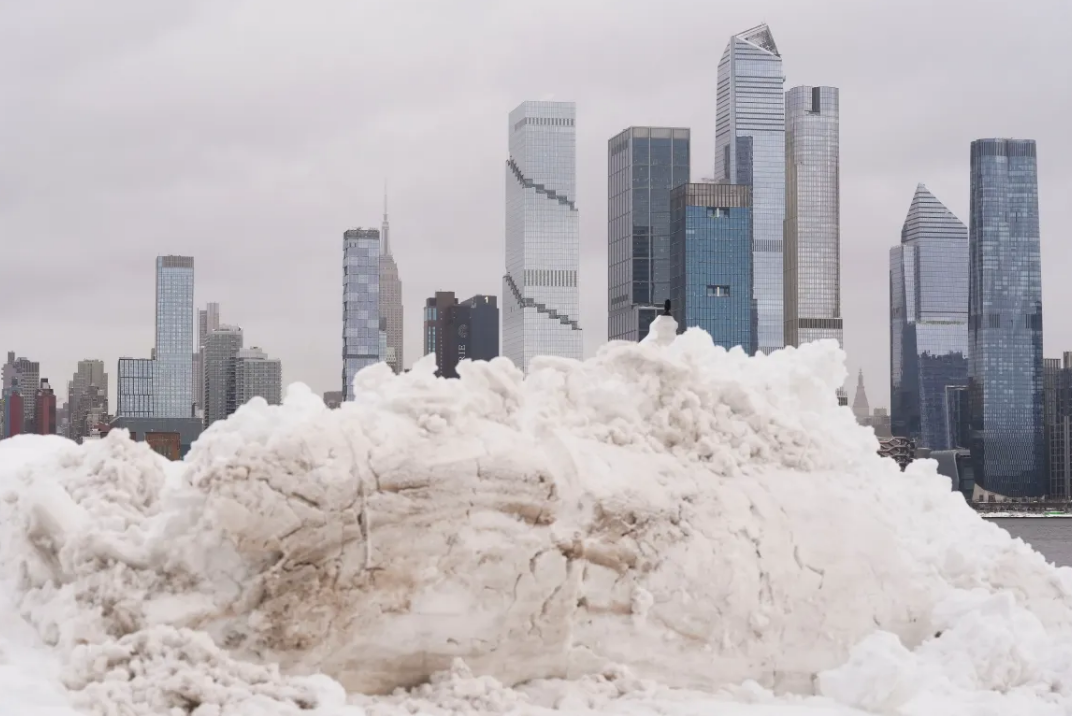 न्यूयॉर्क शहर की स्काईलाइन पर भारी बर्फ के ढेर, मैनहट्टन के पीछे skyscrapers बर्फ से ढके – 2026 snowstorm का खूबसूरत लेकिन खतरनाक नजारा। new york flights cancelled