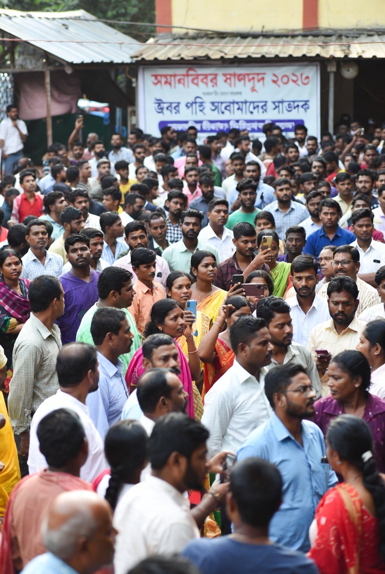 swanirvar bangla कैंप में लक्ष्मीर भंडार के लिए महिलाएं फॉर्म जमा करती हुईं